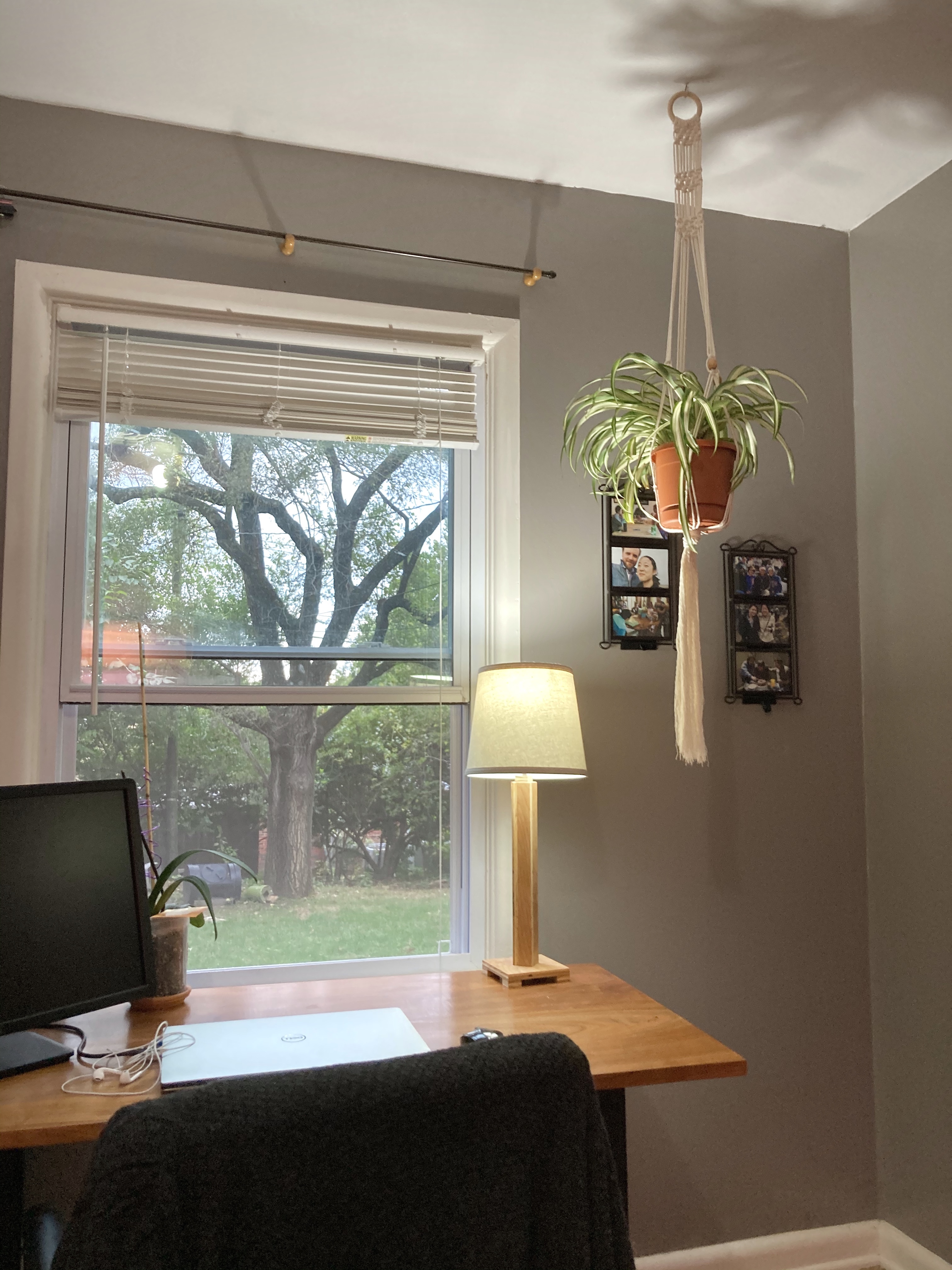 Ian screwed a hook into the ceiling of my home office for me. I spread the netting around the base of the pot and carefully arranged the leaves of my spider plant through the hanging strings.